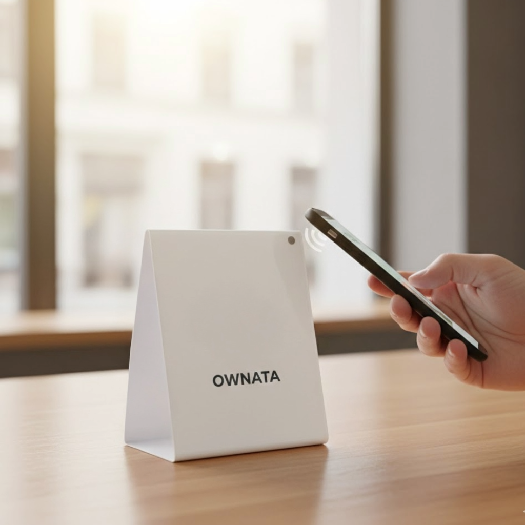 Posé sur votre comptoir, le support Ownata (fourni) permet à vos clients de rejoindre le programme en 3 secondes. Pas d'app à télécharger.